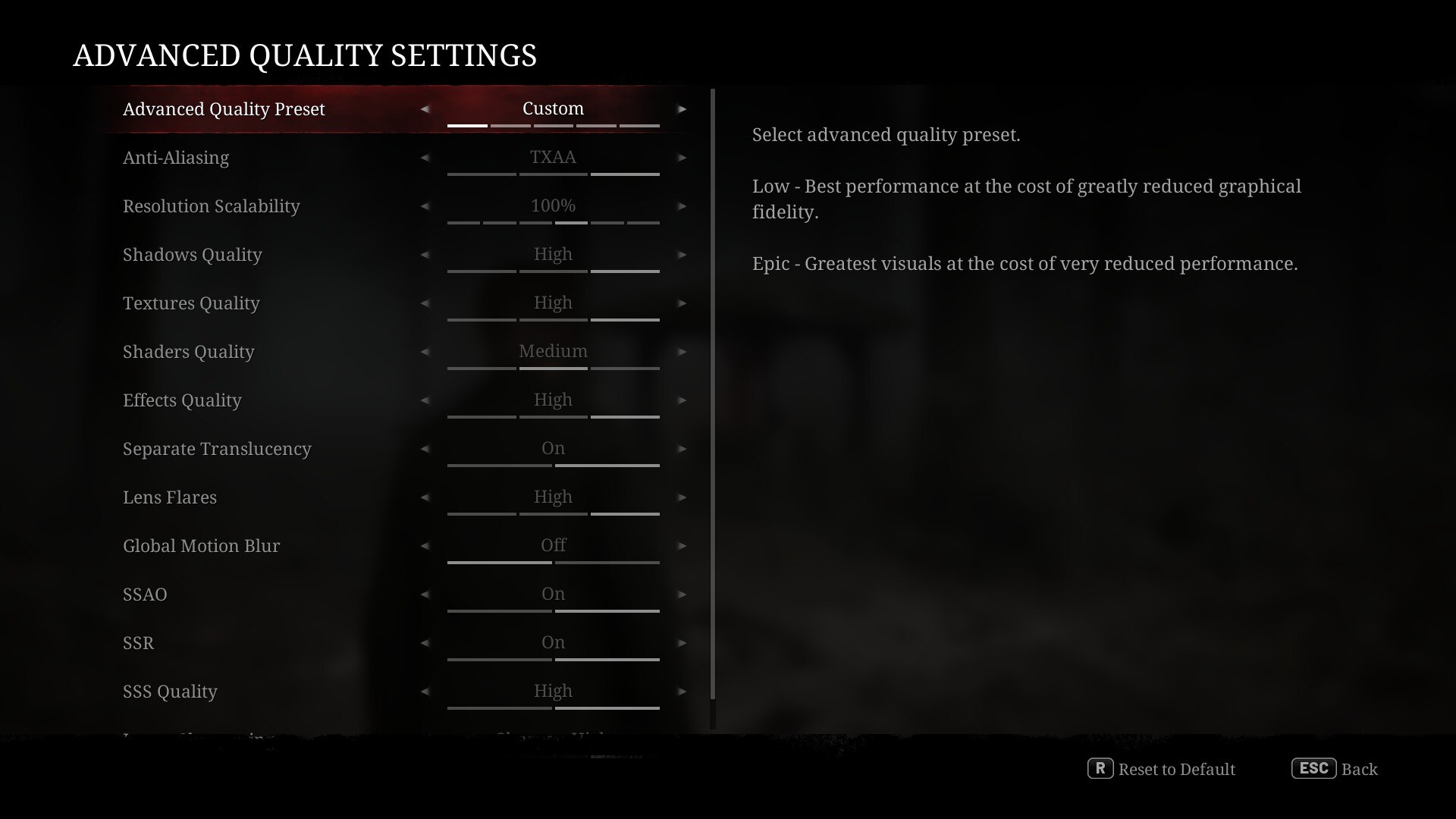 예를 들어 RTX 3050이나 RX 6600, 또는 앞서 언급한 칩의 노트북 버전과 같이 더 낮은 GPU를 사용하는 경우 몇 가지 설정을 더 낮춰야 합니다. 낮춰야 하는 설정은 Textures, Shaders , SSAO , SSR , SSS quality 입니다 .