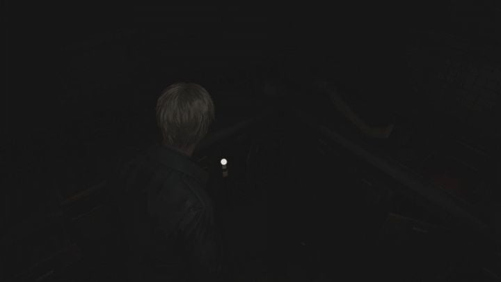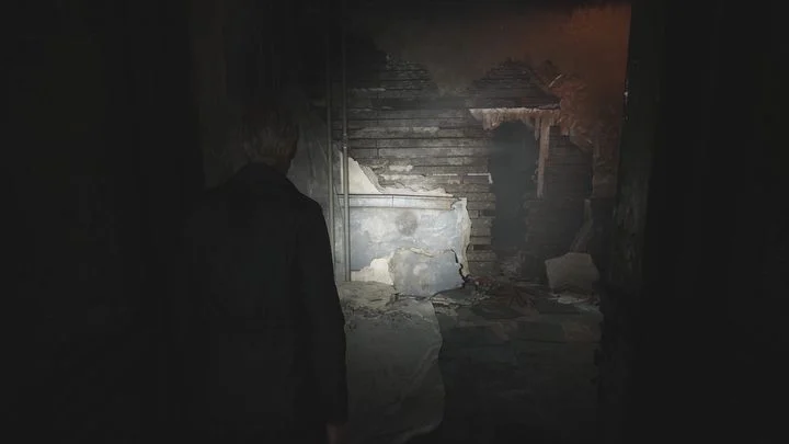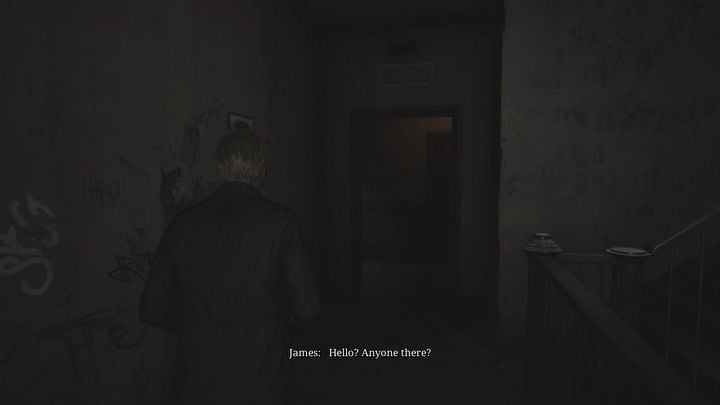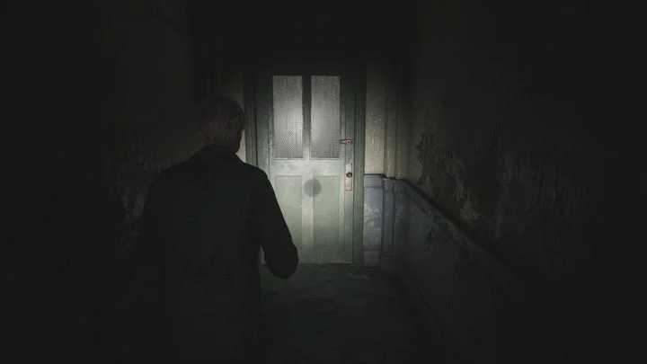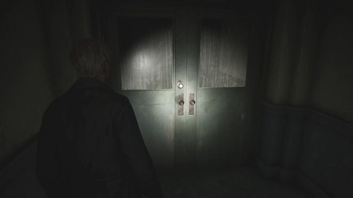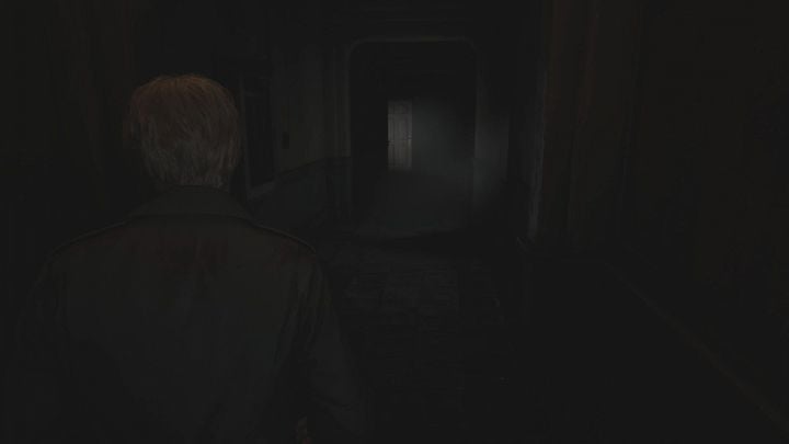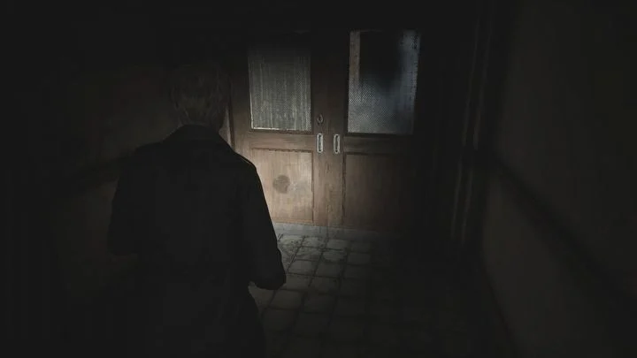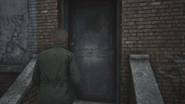 계단을 올라가 1층으로 가서 열쇠를 사용하여 복도의 나머지 부분을 막고 있는 녹색 문을 엽니다. 당신 앞에는 죽은 적이 있습니다. 그는 일어나서는 안 되지만, 만약을 대비해 그를 끝낼 수 있습니다. 복도 끝으로 가세요. 피라미드 헤드와의 첫 만남이 기다리고 있습니다 . 아직은 그에 대해 걱정할 필요가 없습니다. 그는 지금 당장 당신을 지켜보고 있을 뿐입니다 .