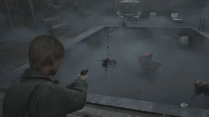 그 후, 열린 창문을 통해 울타리로 막힌 안뜰로 나가세요 . 권총에 탄약이 장전되어 있는지 확인하세요. 여기에는 최대 5명의 상대가 있습니다. 먼저, 빈 풀에 서 있지 않은 두 명을 제거하세요 . 나머지 그룹에서 그들을 유인해내고 탄약을 낭비하지 않고 보드로 하나씩 죽이세요.