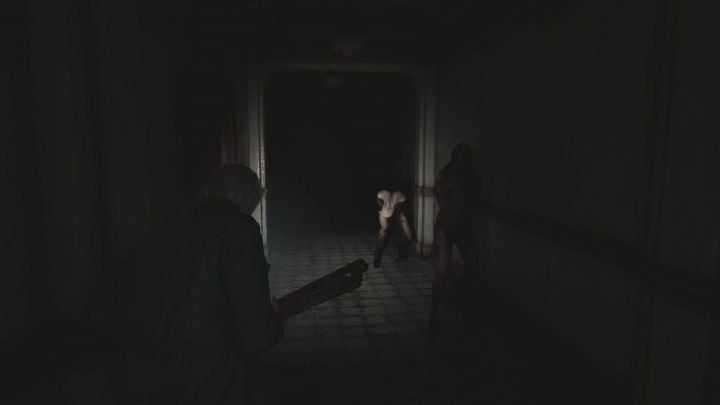 방을 나간 후 어두운 복도로 가세요. 가는 길에 벽에 있는 곤충을 죽이세요. 복도 중앙에 있는 열린 아파트 로 들어갈 수도 있습니다. 그곳에서 적을 죽이고 권총을 위한 총알 두 발을 가져가세요. 결국 복도 끝에 있는 막대 에 도착하게 됩니다 . 막대 뒤에 있는 열쇠를 집어서 컷씬을 보세요 .