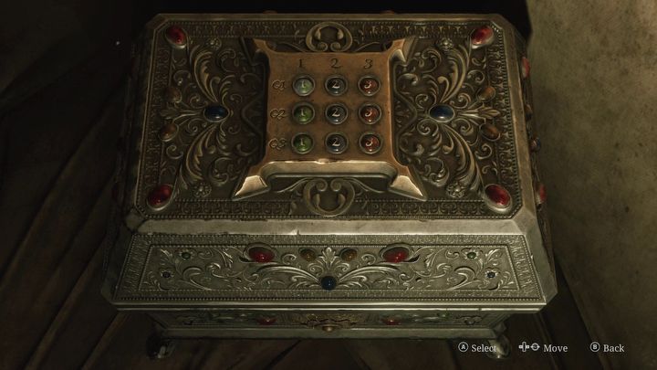 얼마 후 , 두 개의 반지를 얻고 병원에서 탈출하기 직전에 약국을 방문할 수 있습니다. 거기에는 장식 상자가 있습니다 . 여기서 질문에 대한 답을 입력할 수 있습니다. 따라서 상자의 코드는 231 (위에서 입력)입니다. 상자를 열 기회는 한 번 뿐입니다. 성공하면 상자가 열리고 산탄총 탄약 5개와 주사기 2개를 가져갈 수 있습니다 .