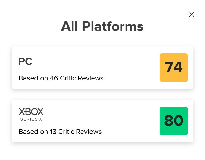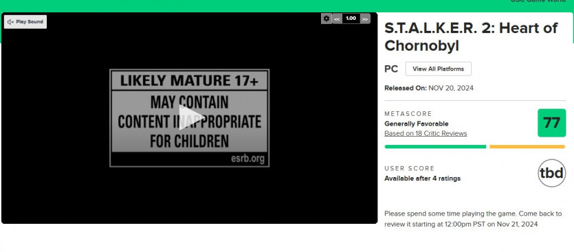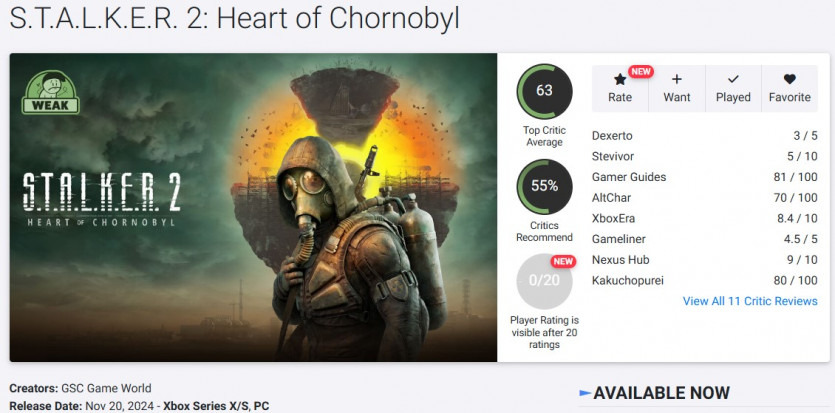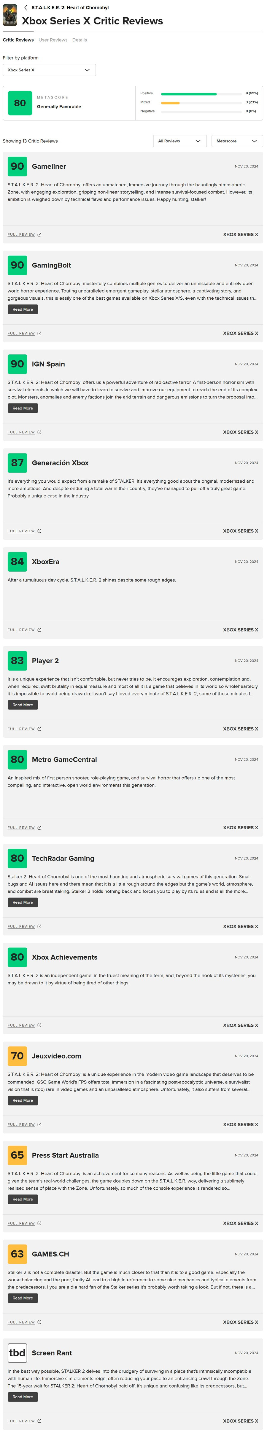 이 글을 쓸 당시, STALKER 2는 집계 사이트 Metacritic 에서 "일반적으로 호의적"인 전반적인 리뷰 점수가 약 77/100이며, 44개의 Windows PC 리뷰를 기준으로 평균 76/100, 12개의 Xbox Series X|S 리뷰를 기준으로 평균 79/100을 받았습니다. 대부분 평가는 80-90 범위 어딘가에 해당하는 등급을 주지만, 70점대, 심지어 60점대 리뷰도 꽤 많습니다. 의견 범위를 보여주는 인용문과 점수의 요약은 다음과 같습니다.