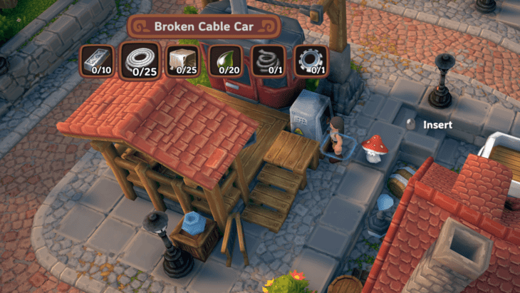 산으로 가는 길을 열려면 마을 중앙, 잡화점 바로 뒤에 있는 케이블카를 수리해야 합니다. 이를 위해 적절한 재료가 필요합니다.