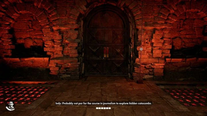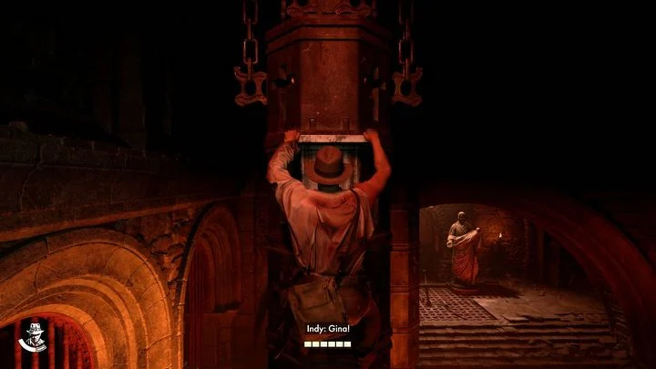 - Indy는 자동으로 Gina에게 도움을 요청합니다. 방의 반대편에 있는 위쪽 구멍에 가까이 다가갈 때까지 움직이지 마세요 (위의 스크린샷). 그쪽으로 점프한 다음 바닥의 구멍으로 점프하세요 .