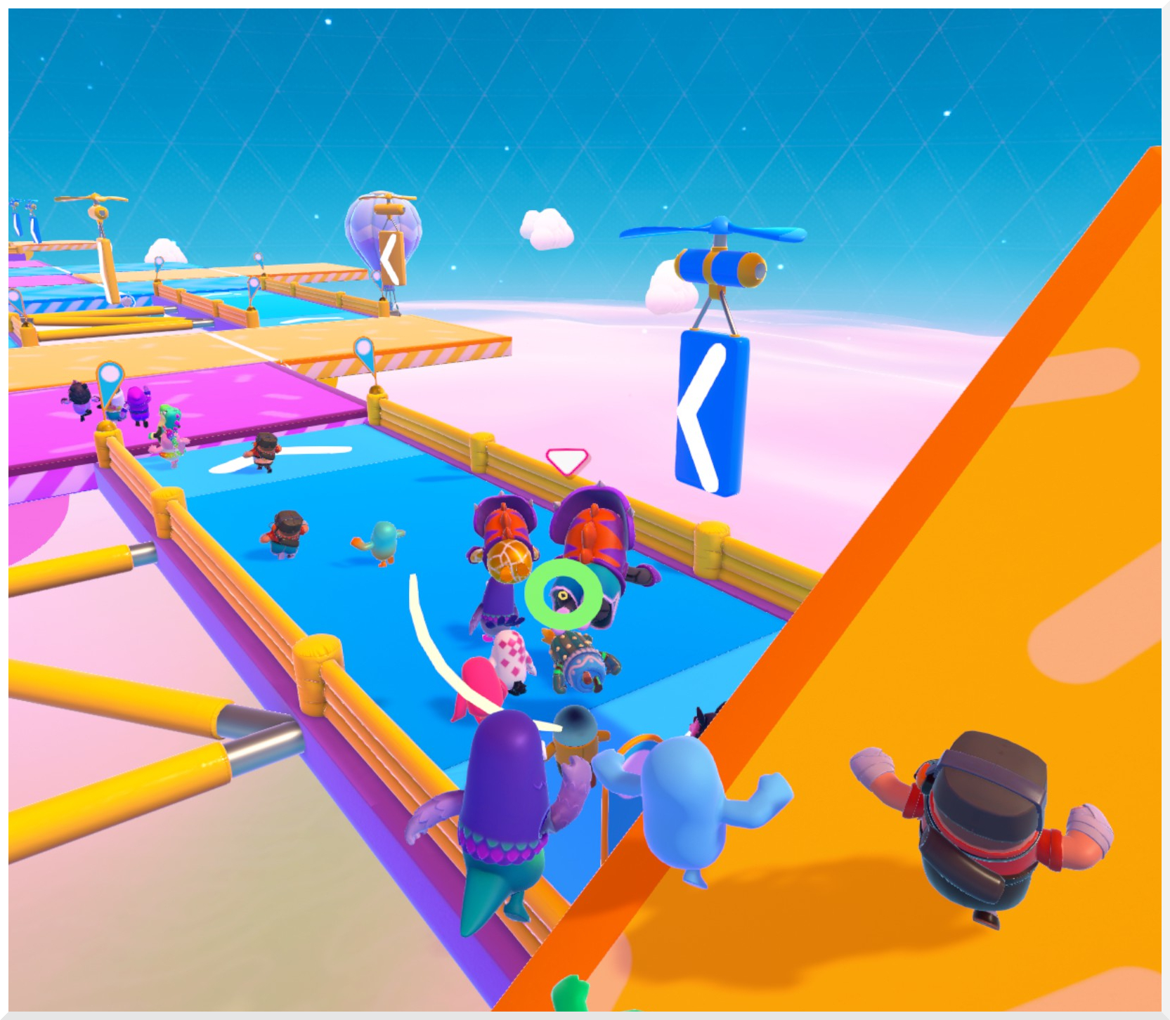 - 마지막 장애물 중 하나는 매우 느리게 움직이는 거대한 팬입니다. 점프하는 동안 팬과 충돌하지 않도록 점프 시간을 잘 정하십시오. 그뿐만 아니라, 다른 플레이어가 착지 구역에 붐비면 튕겨서 플랫폼에서 떨어질 수 있기 때문에 통과 할 때 실제로 착지 할 공간이 있는지 확인하십시오.