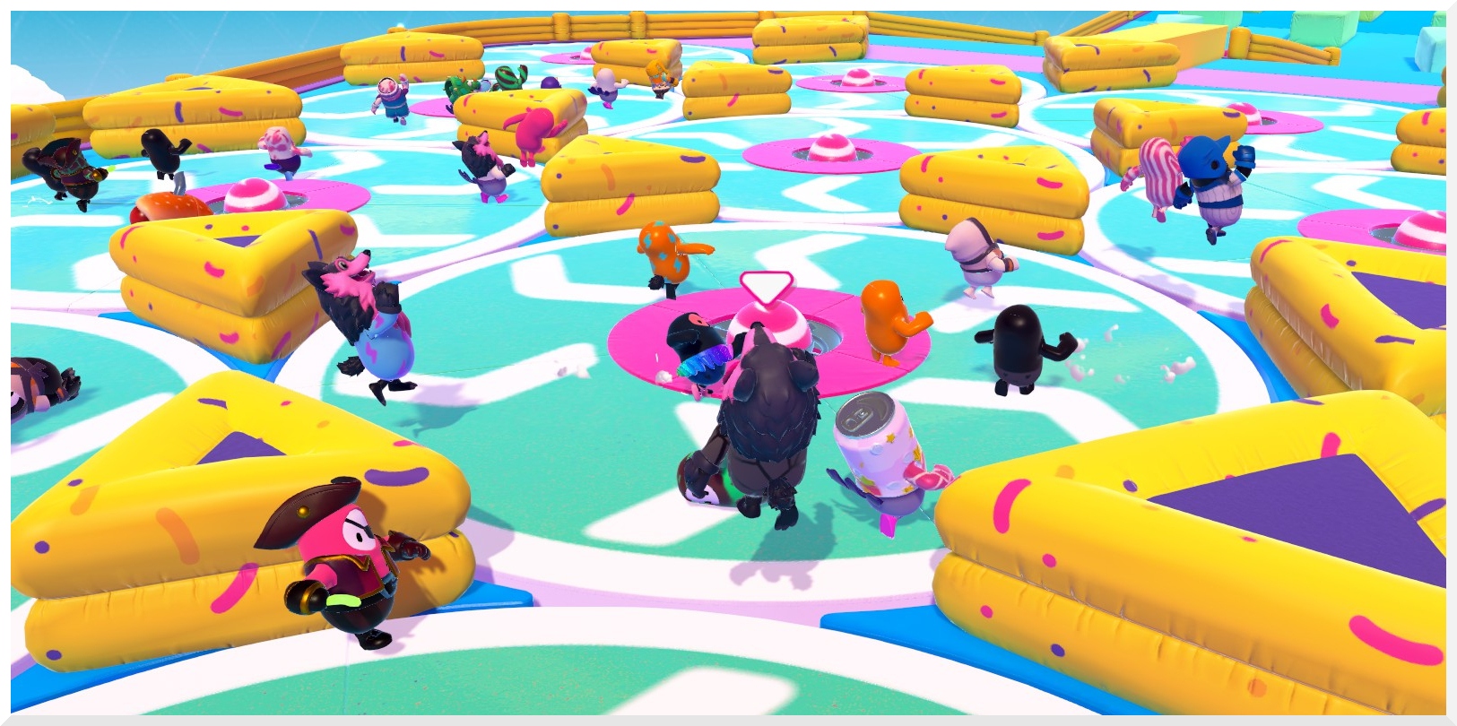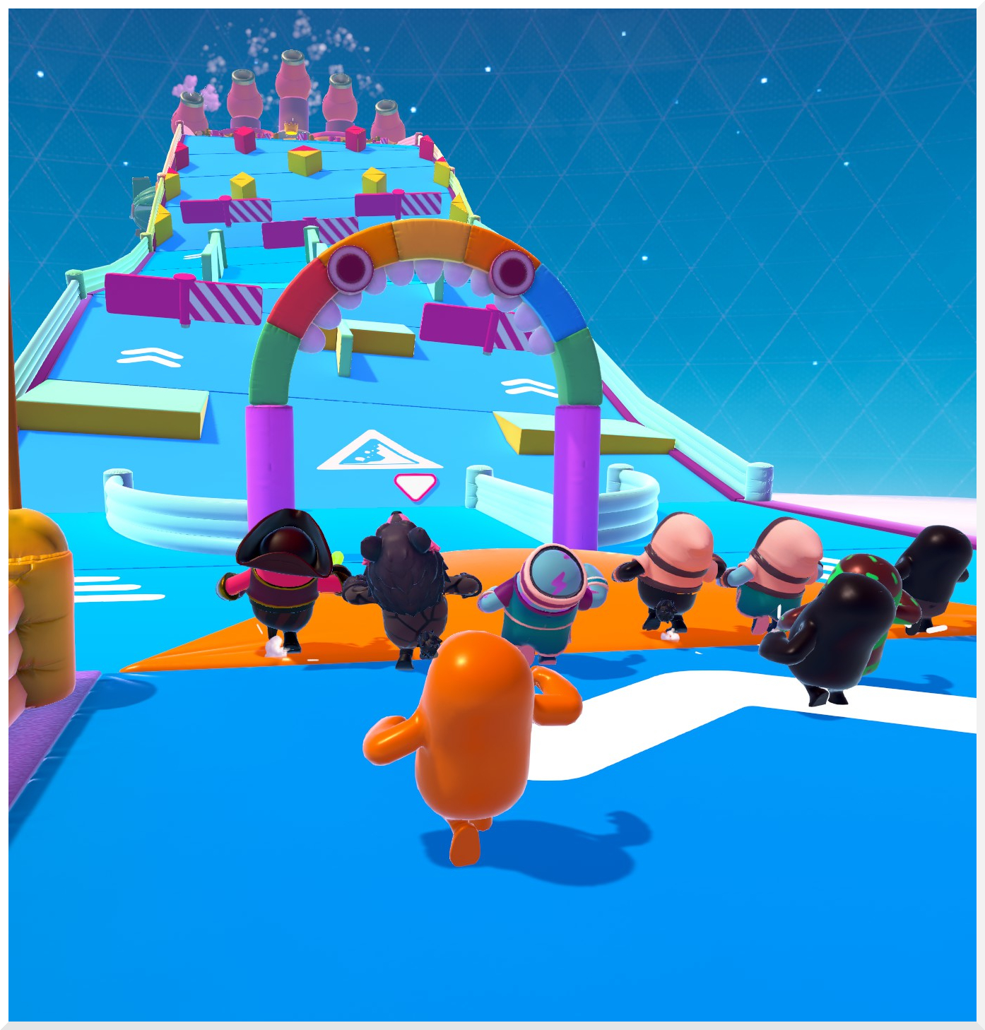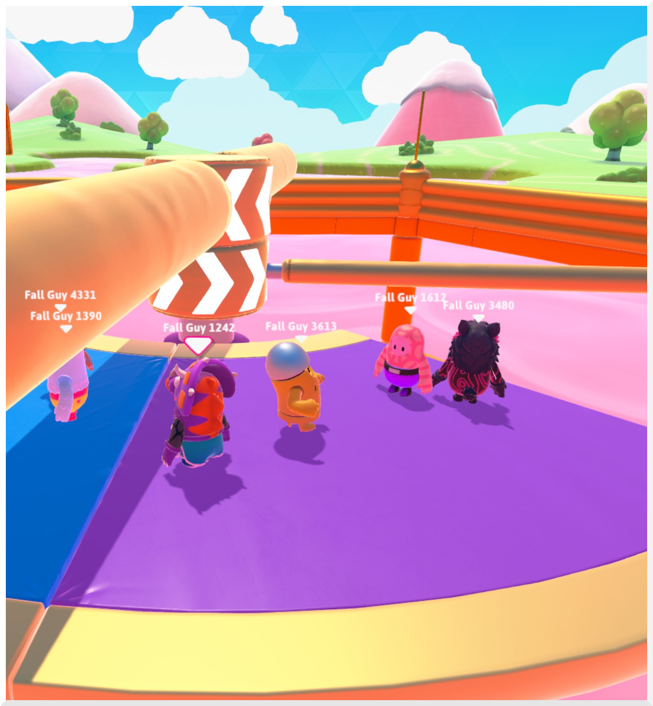에서 블록 파티 이동 벽의 일련의 플랫폼 오프 선수를 밀어 수있는 화면 밖으로 표시하면서, 모든 플레이어는 플랫폼에 서있다. 각 벽에는 제거를 피하기 위해 모든 플레이어가 통과해야하는 개구부가 있습니다. 일부 벽에는 점프해야하는 작은 장애물이 있습니다.