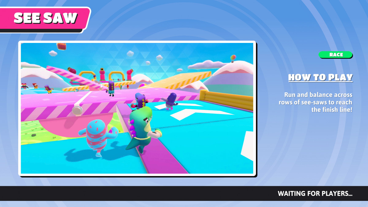 - 이것은 결승점까지의 자유 경주이지만 때로는 다른 플레이어와 협력하여 시소를 안전한 위치로 기울여 앞으로 나아갈 수 있습니다. 플랫폼을 올바른 방향으로 기울이는 데 도움이되는 지나치게 열성적인 플레이어 그룹에 대항하는 것을 두려워하지 마십시오.