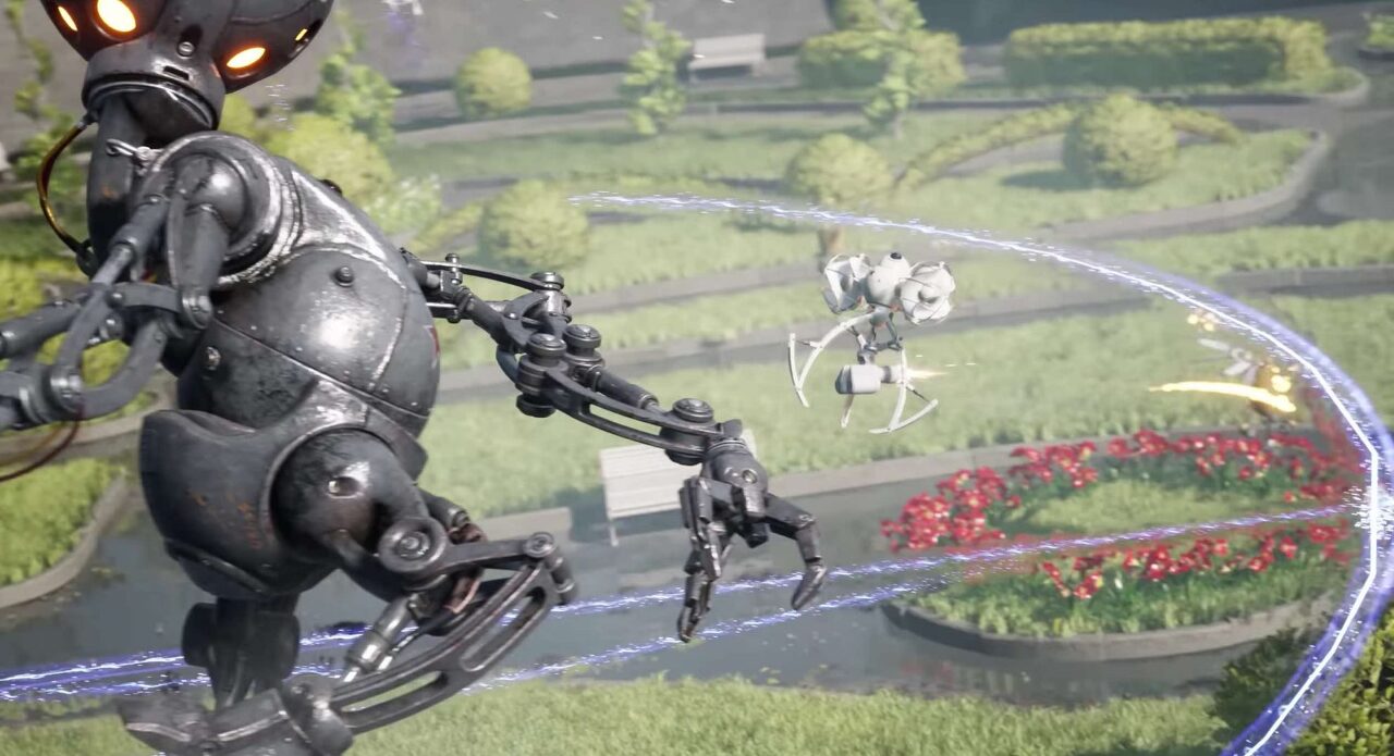화면은 크게 각도를 회전 P-3의 주위의 상황을 잘 알 수있게된다. 그가 싸우고있는 것은 전장에 어울리지 않는 손질 된 정원의 한가운데. 수많은 소형 드론이 허공을 흩날리고있어 P-3의 정면에는 당장 거대한 암석을 던지려는 이족 보행 로봇이 대치하고있다. 이 때, 환경의 빛 표현에 주목 해 보자. 야외에서 쏟아지는 햇빛, 난무하는 레이저. 여러 가지 광원에 의한 반사와 그림자의 변화가 로봇의 금속적인 질감을 요염 비추고있다. 지상의 물웅덩이나 원경에 보이는 거대한 태양 전지판 보이는 구조물의 표면에도 선명하게 반사 동상이 비치고있는 것도 포인트 다.