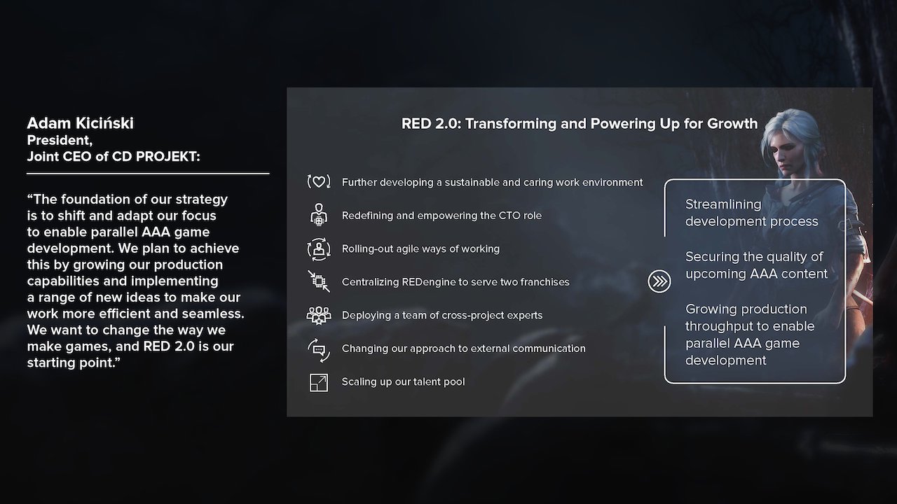 CD PROJEKT Group 사장 Adam Kicinski 씨는 회사가 지향하는 목표로 전 세계 게이머의 마음에 직접 닿는 혁신적인 이야기 주도 RPG를 제작하는 세계에서 세 손가락에 들어갈 개발자하다고 평가 할 세계의 대중 문화 속에서 회사의 브랜드를 지속적으로 존재하기의 3 가지를 들고있다. 그리고 "사이버 펑크 2077"예상대로 출시를 맞아 못했음에도 언급하면서 "RED 2.0"이라고 이름 붙였다 게임 개발 체제의 전환을 실시했다.