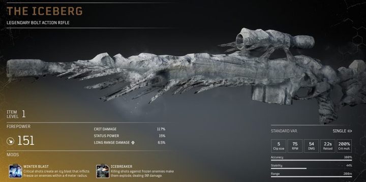 이 볼트 액션 라이플은 크리티컬 샷으로 적에게 얼어 붙게합니다. 또한 얼어 붙은 적을 죽이면 폭발하여 주변 적에게 피해를줍니다.