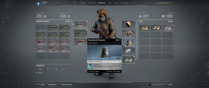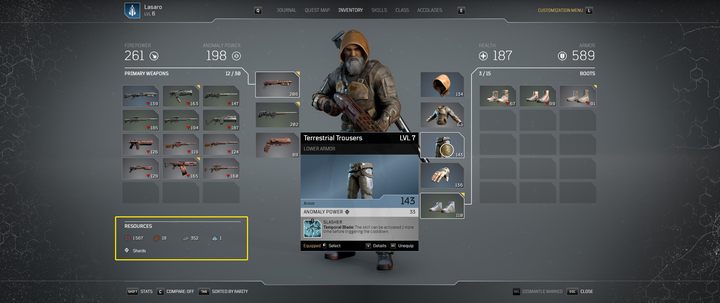 장비를 제작하고 업그레이드하는 데 필요한 여러 유형의 재료를 게임에서 사용할 수 있습니다. 아래 스크린 샷은 수집 한 리소스의 양을 표시하는 창을 보여줍니다.