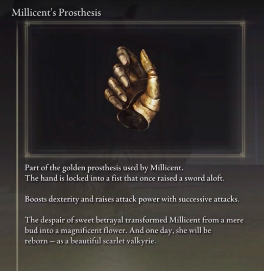 Millicent Prosthesis가 존재하는 주된 이유는 플레이어의 전반적인 민첩성 포인트를 향상시켜 빌드를 훨씬 더 실용적으로 만들 수 있는 동시에 플레이어가 계속 진행함에 따라 주로 민첩성에서 축소되는 무기의 공격력을 강화하는 것입니다. 적을 뚫기 위해.