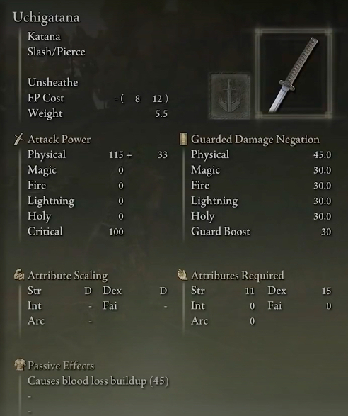 무기 자체는 힘과 민첩성에 비례합니다. 따라서 플레이어는 무기를 이미 있는 것보다 훨씬 더 강력하게 만들 수 있도록 해당 속성에 약간의 포인트를 투자하는 것이 좋습니다. Uchigatana는 패시브를 가지고 있어 적에게 심각한 출혈을 일으켜 훨씬 빨리 죽게 만듭니다.