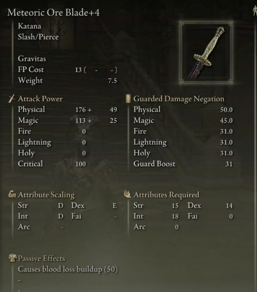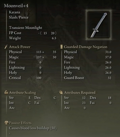 Uchigatana 또는 Moonveil Katana를 손에 휘두르면 플레이어는 무기의 피해량을 활용할 수 있으며, 무기 중 하나는 플레이어에게 유용할 수 있는 마법 피해량을 출력할 수도 있습니다.