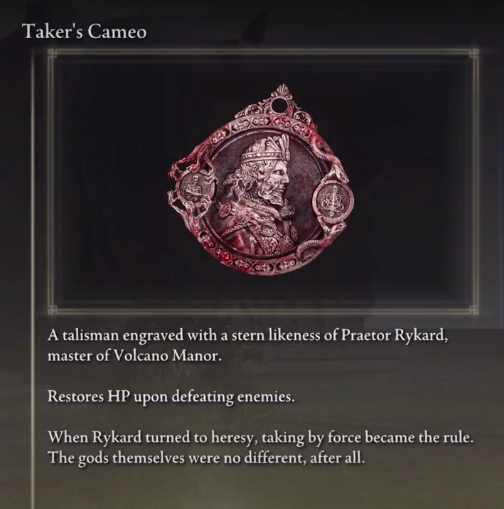 그 회복을 얻고 플레이어가 적과의 전투에서 결국 죽지 않도록 하기 위해 Taker's Cameo 는 플레이어가 전장에서 바쁜 동안 어떤 종류의 이후에 체력 포인트의 일부를 회복하여 플레이어를 계속 살려줄 것을 약속합니다. 상대가 완전히 사라졌다.