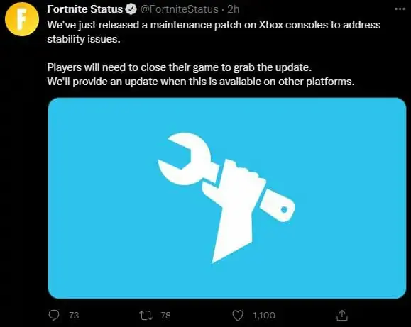 Fortnite Status Twitter 계정은 안정성 문제를 해결하기 위해 유지 관리 패치가 모든 Xbox 콘솔에 푸시되었다고 발표했습니다. 플레이어가 새 패치를 다운로드하려면 게임을 닫아야 했습니다.