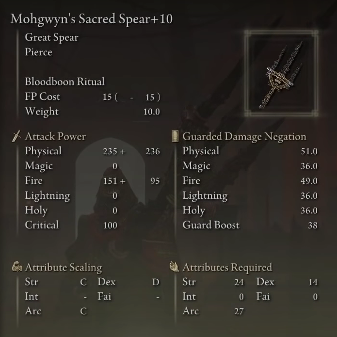 Elden Ring의 멀티플레이어에서 터프한 플레이어와 싸우고 있는 자신을 발견했다면 Mohgwyn의 Sacred Spear를 휘둘러 무장으로 전투를 장악하십시오. 무기의 효능과 Elden Ring의 최고의 주문을 결합하면 모든 시합에서 확실히 1위를 차지하게 됩니다. Mohgwyn의 신성한 창을 실제로 휘두르는 데 필요한 요구 사항은 27 Arc , 24 Str 및 14 Dex가 필요합니다.