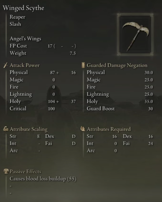 게다가 날개 달린 낫 외에는 아무것도 없이 엘든 링을 플레이한 일부 플레이어는 이 무기가 게임을 이지 모드로 변형시킨다고 말합니다. 16 Dex, 16 Str, 24 Fai인 이 무기를 휘두르기 위한 초기 요구 사항을 충족한 후 해야 할 일은 믿음 속성에 투자하는 것뿐입니다. 그러면 기본적으로 날개 달린 낫을 가진 괴물이 될 것입니다.