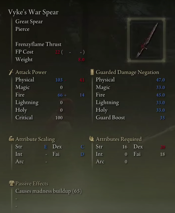 이 Great Spear로 적을 공격할 때 당신은 그들의 광기 막대를 채우고 있을 뿐만 아니라 당신 자신에게도 똑같이 하고 있습니다. 광기 상태 효과가 PvP에서 자신이나 상대 플레이어에게 적용되면 더 이상 특수 기술이나 주문을 사용할 수 없을 때까지 포커스 포인트(FP)가 고갈되기 시작합니다. 그 외에도 실제 플레이어와 싸울 때 Vyke의 War Spear를 사용하려는 여러 가지 이유가 있습니다.