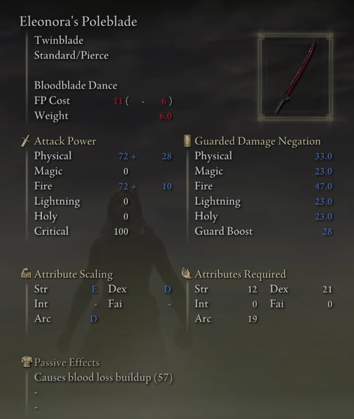 이 무기에 넘겨야 합니다. Eleonora의 Poleblade는 Elden Ring의 실제 괴물입니다. 적용된 버프, 부적 또는 기타 효과의 수에 관계없이 이것만큼 빠르고 치명적인 무장은 찾을 수 없습니다. 당연히 쌍날검 계열 의 무기인 엘레오노라의 장대검은 감히 그 앞에 설 수 있는 자를 단숨에 제압하는 데 능하다. 주로 문제의 무기에 따라 조정되는 민첩성 과 비전 속성 이 있습니다.