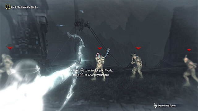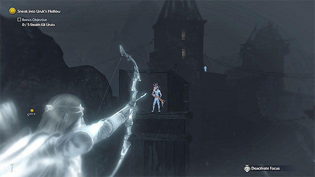 폐허를 건너는 동안 보조 목표를 완료할 수 있는 기회를 얻습니다. 두 명의 오크 궁수를 머리에 쏴서 제거하려면 활을 사용해야 합니다. Wraith Mode를 사용하여 궁수를 찾고 사격 시간을 늦추십시오(다른 신체 부위를 명중하면 2차 목표가 취소됨).