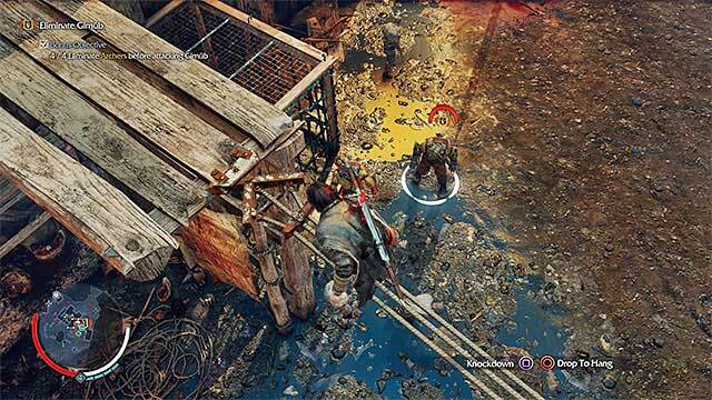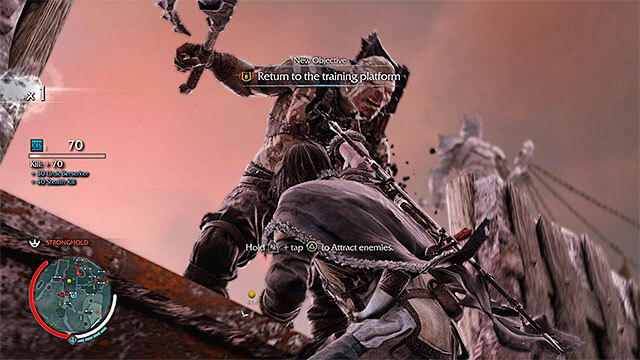 기무브를 제거하기 전에 진영에서 4명의 오크 궁수를 제거하는 것이 좋을 것입니다. 이는 임무의 보조 목표에서 요구하기 때문입니다. 궁수들은 근처의 목조 구조물에 있습니다. 경보를 울리지 않고 가장 가까운 곳에 접근하십시오(오크 전사에게 몰래 다가가지 마십시오). 비계를 오르면 뒤에서 궁수를 데려와 잠입 처형을 한다.
