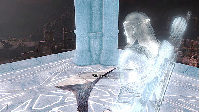 경로를 따라 더 나아가 경로 중 하나에 있는 오크 순찰을 조심하십시오. 오크 주변을 걷거나 공격할 수 있습니다. 발자취를 따라 가면 마침내 동굴에 들어갈 수 있습니다. Wraith 모드에 들어가서 계속 유지하십시오. 위의 선반에 도달하고 여기에서 대화형 메달을 찾으십시오. 이 메달은 땅에서 수집해야 합니다.