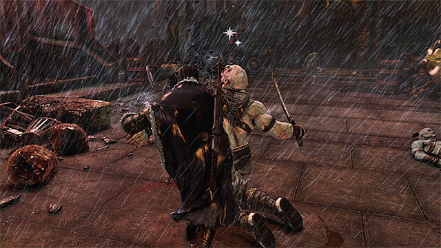 랫백을 심문하고 고로스에 대한 정보를 얻은 후 오크를 따라가십시오. 당신은 곧 적대적인 오크의 공격을 받는 작은 폐허에 도달할 것입니다. 그 중에는 긴 칼날과 방패를 사용하는 독특한 오크 변종인 Defender가 적어도 한 명 있습니다. 방패가 파괴되기 위해서는 몇 번의 강한 타격이 필요하기 때문에 이것이 여기서 가장 문제가 될 것입니다. 방패를 부수려고 하는 것보다 수비수를 뛰어넘는 것이 훨씬 좋습니다(오크에게 달려간 후 점프 버튼을 누름). 덕분에 그의 등 뒤에 착지하여 그에게 피해를 줄 수 있습니다. 그가 돌아서기 전에.
