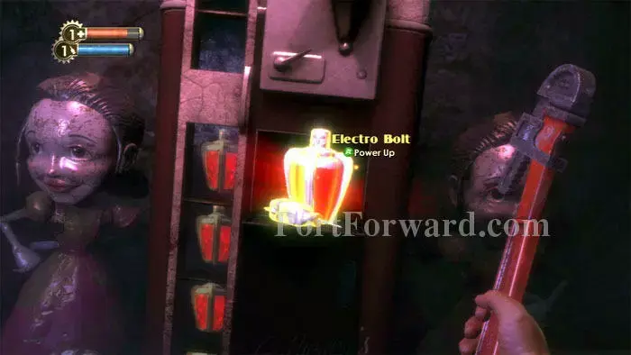 Big Daddy가 스플라이서를 완성했으면 렌치로 자물쇠와 사슬을 부수고 오른쪽에 있는 문을 통과하세요.
