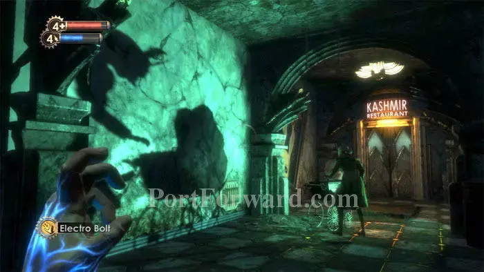 게임은 여기 카슈미르 레스토랑에서 본격적으로 시작됩니다. 오른쪽에 있는 계단을 내려가 문을 두드리는 Thuggish Splicer를 처치하십시오.