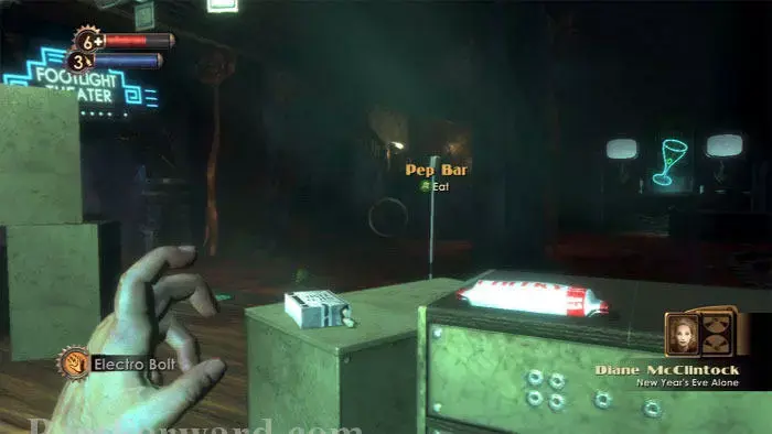 Pep Bar가 여기 있고 또 다른 EVE Hypo가 있습니다. Footlight Theatre 문이 막혔습니다. 바 뒤 오른쪽 네온 칵테일 사인 옆에 응급 처치 키트와 금전 등록기가 있습니다.