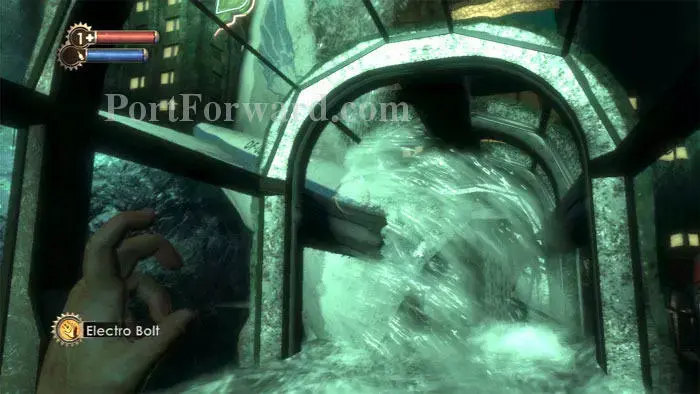 Andrew Ryan의 이 메시지를 보십시오. 더 많은 스플라이서가 접근하려고 시도하지만 안전 유리에 의해 저지됩니다. Atlas는 압력 도어를 다시 활성화할 수 있습니다. 그것을 사용하여 의료로 진출하십시오.
