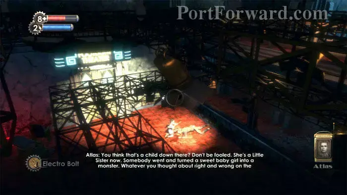 반대편 방으로 이동하면 Thuggish Splicer가 나타납니다. Atlas는 Electro Bolt로 적을 기절시킨 다음 렌치로 마무리할 것을 조언합니다. Atlas는 이 기절 및 강타 전술을 "원 투 펀치"라고 부릅니다. 창문에 몸을 대고 있는 EVE hypo에 주목하세요.