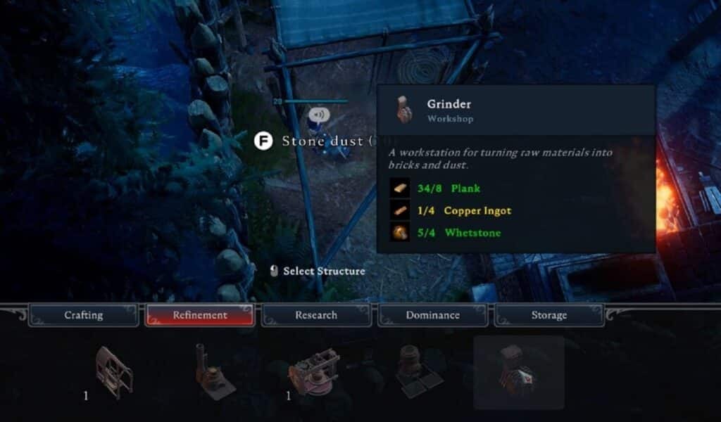 V Rising에서 자신만의 Grave Dust를 제작하려면 작업을 완료하기 위해 Grinder가 필요합니다 . 분쇄기는 건설 메뉴의 생산 및 정제 섹션 에서 찾을 수 있으며 다음 재료가 필요합니다.