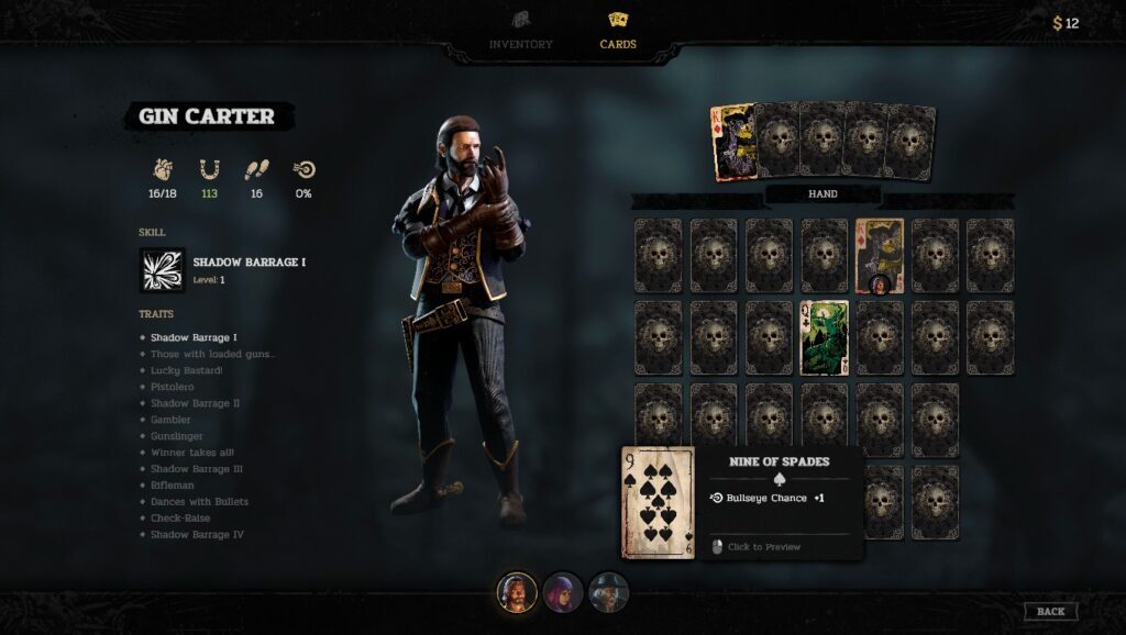 우리는 카드 놀이에 대해 이야기하지 않고 Hard West 2에 대한 이야기를 끝낼 수 없습니다. 개별적으로 카드는 통계에 약간의 버프를 추가합니다. 그러나 그들과 포커 핸드를 형성하면 특성을 잠금 해제할 수 있습니다. 일부 특성은 잠금을 해제하기 전에 특정 유대 수준에 도달해야 합니다. 약간 번거롭지만 어디서 오는지 이해합니다. 게임에서 최고의 기술을 가지고 좋은 핸드를 만들 수는 없습니다.