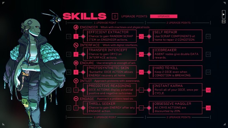 Citizen Sleeper는 이 순간을 사용하여 개발자 Jump Over Age의 이야기에서 진정한 적대자인 자본주의의 모든 고통을 겪습니다. 처음 도착했을 때, 나는 완전히 압도당하고 보이지 않는 느낌 없이 한 사이클을 통과하기 위해 고군분투했습니다. 돈을 벌 수 없었기 때문에 에너지를 유지하는 데 필요한 음식을 살 수 없었습니다. 그 결과 건강이 급속도로 악화되었고 이 고군분투로 약을 살 여유가 없었습니다. 이것은 내가 바닥에 닿을 때까지 자체적으로 구축되어 세련된 기술 화면에 표시되는 Sleeper의 핵심 능력 중 하나에서 나를 가두었습니다. 주요 목표를 완료한 후 획득하는 업그레이드 포인트로만 잠금을 해제할 수 있었습니다. 그러나 그것을 달성하기 위해서는 큰 주사위나 적어도 여러 개의 주사위가 필요했습니다. 덤프에 있는 내 상태로는 둘 중 하나를 얻는 것이 불가능하다고 느꼈습니다.