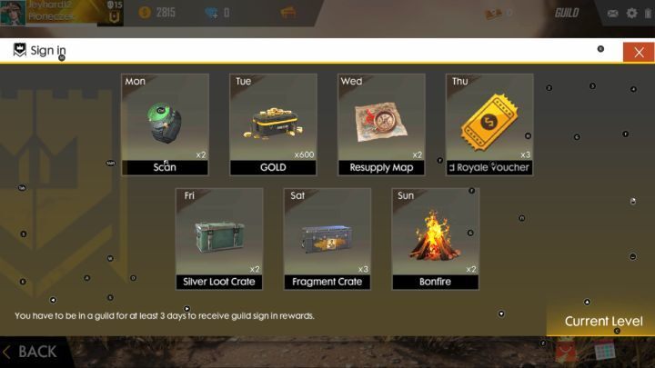 Garena Free Fire 의 길드 는 단순히 플레이어 그룹입니다. 주요 전제는 수십 명의 사람들이 기꺼이 즐길 수 있는 다른 플레이어를 쉽게 찾을 수 있도록 하는 것입니다. 하지만 길드와 관련된 일일 도전 과제도 있습니다. 길드 가입 후 참여하실 수 있습니다. 또한 길드는 다른 플레이어 그룹과 경쟁하는 토너먼트에 참가할 수 있습니다.