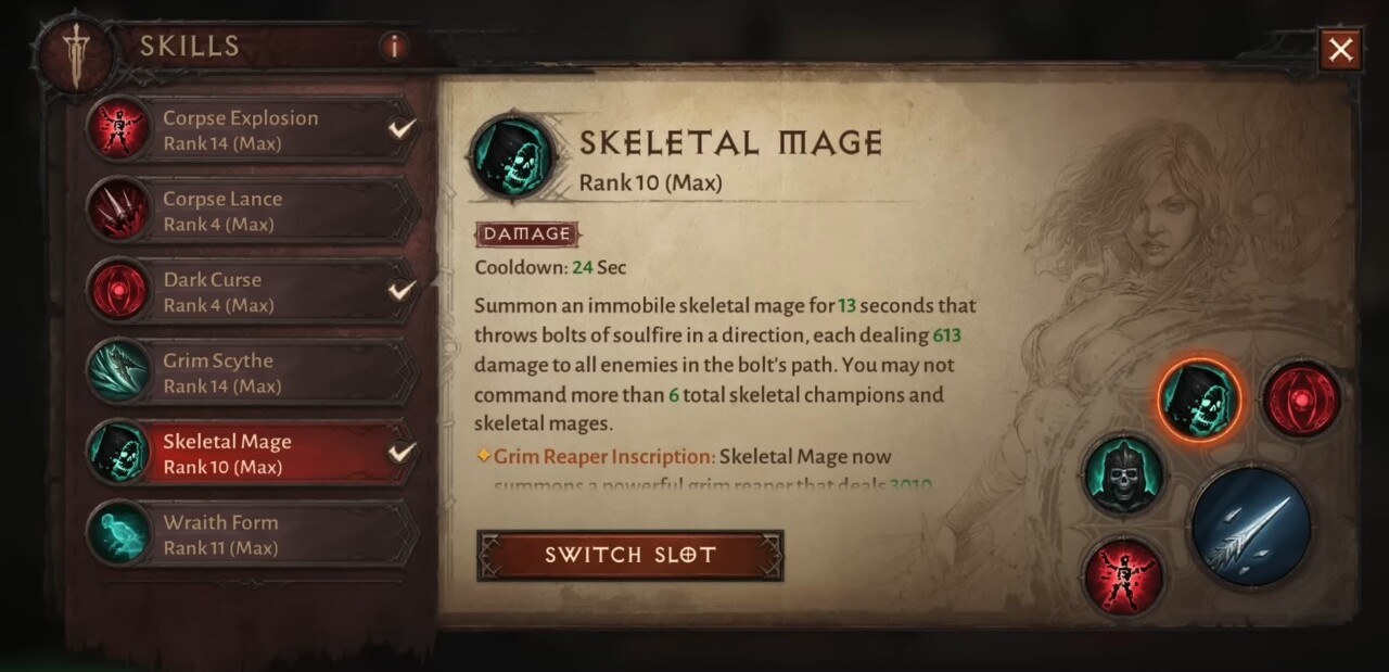 - Skeletal Mage: 이 독특한 기술을 사용하면 13초 동안 자신만의 Skeletal Mage 를 소환할 수 있습니다 . 이 마법사 는 짧은 시간 동안 지정된 방향으로 영혼불의 화살을 던집니다 . 이것은 Diablo Immortal에서 이 클래스의 주요 DPS 기술이 될 것입니다.