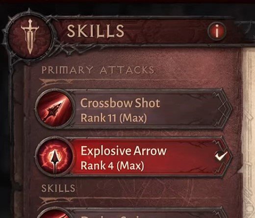- 폭발 화살: 이 스킬은 미친 피해를 줄 수 있는 폭발 화살을 제공합니다. 이 공격은 직접적인 충격을 받으면 폭발하며 가까운 다른 적에게 25%의 광역 피해를 줍니다.