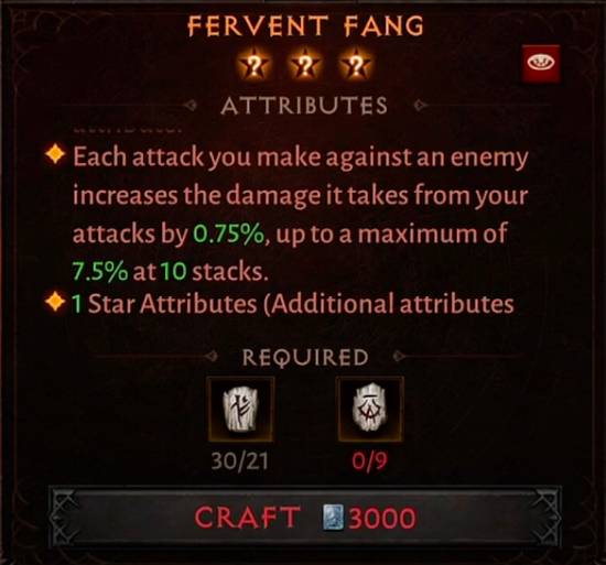 Diablo Immortal에서 보석에 대한 또 다른 실행 가능한 옵션 은 A-랭크 보석으로 대부분 순위가 매겨지는 Fervant Fang 입니다. 또한 일반적인 공명을 30, 플레이어의 전투 등급을 12로 향상시켰지만, 아래에서 볼 수 있듯이 전투에서 다른 많은 용도도 사용할 수 있습니다.