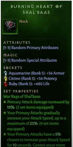 조각에 대한 별도의 통계는 없으며 장착할 수 있는 몇 개의 소켓이 있습니다. 이 목 부분의 경우 Demon Hunter 클래스 플레이어 는 56 등급의 아쿠아마린으로 갈 수 있습니다. 5등급의 황수정 보석은 위력을 56만큼 증가시키고, 5등급의 루비 보석은 680의 생명력/HP를 추가합니다.