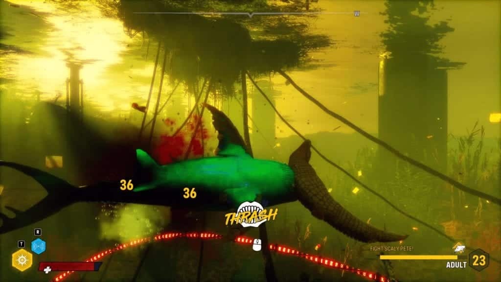 Thrashing은 씹는 것이 아니므로 "Thrash"라고 표시되고 먹이가 입 안에 있으면 공격 버튼을 누른 상태에서 머리를 앞뒤로 움직이기만 하면 됩니다. PC를 사용 중이라면 공격 버튼(오른쪽 클릭)을 누른 상태에서 마우스를 왼쪽에서 오른쪽으로 움직이면 됩니다. 컨트롤러에서는 오른쪽 트리거를 잡고 오른쪽 아날로그 스틱을 왼쪽에서 오른쪽으로 움직입니다.
