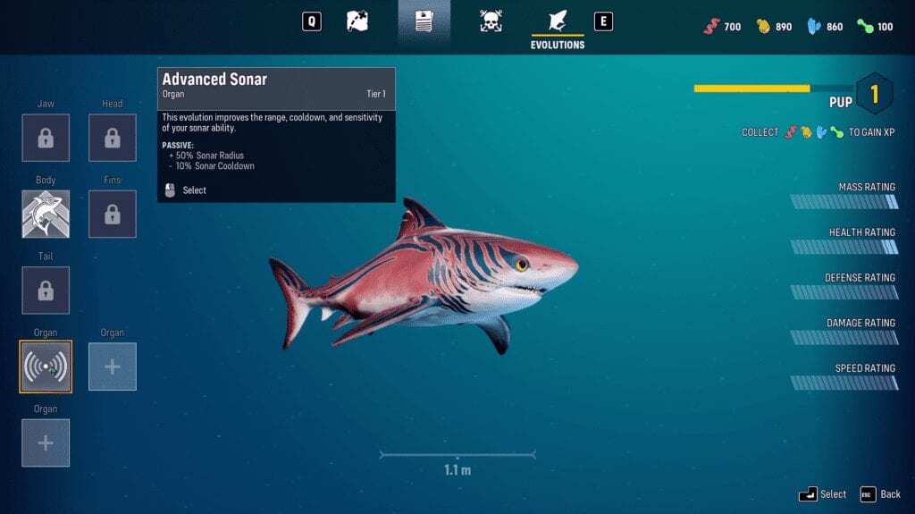 소나를 업그레이드하는 데 2000개의 유전자만 필요하므로 게임 초반에 이 작업을 수행해야 합니다. 2단계 업그레이드는 +100 소나 반경과 -20% 소나 쿨다운을 제공합니다. 이것은 나중 티어에 비해 작은 감자이지만 쉬운 보상을 얻을 수있는 위치를 찾는 데 실제로 도움이 될 것입니다. 업그레이드를 최신 상태로 유지하고 더 빨리 업그레이드하십시오.
