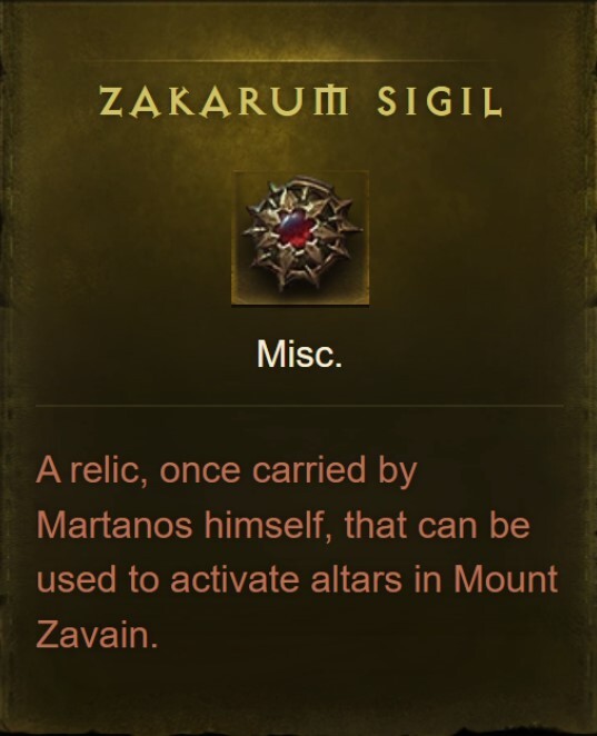 Lord Martanos를 처치하면 Zakarum Sigil을 얻을 수 있지만 여전히 제단을 활성화할 수 있습니다. 그러나 자카룸 인장이 없으면 각 제단이 활성화되는 데 1분이 걸립니다. 전투 중에는 가장 효과적인 방법이 아닌 것 같지만 어쨌든 사용하십시오.