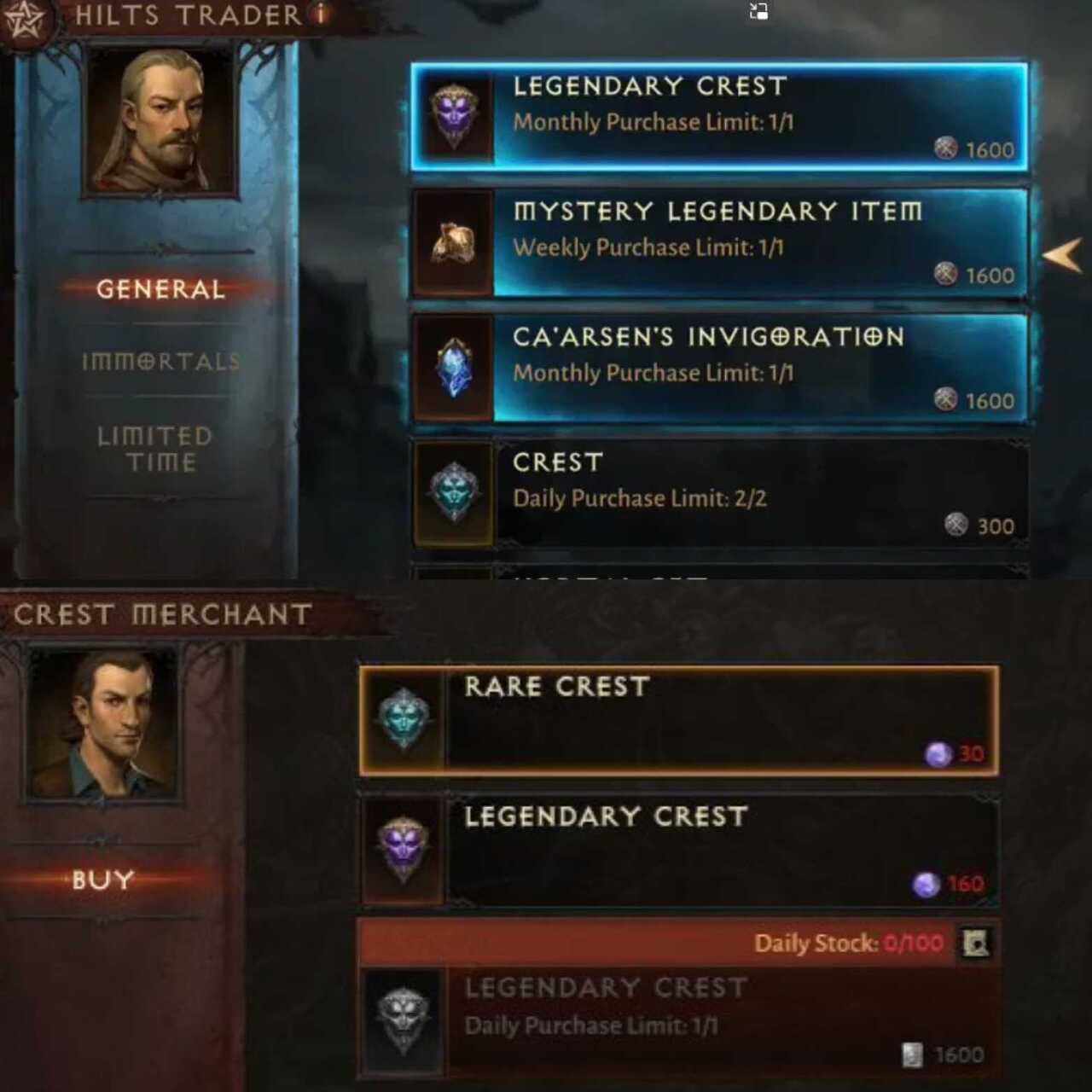 때때로 Hilts Trader는 더 많은 Crest를 구매할 수 있는 임의 의 기간 한정 거래를 제공합니다. 따라서 그가 보유하고 있는 재고를 자주 확인하는 것이 좋습니다.