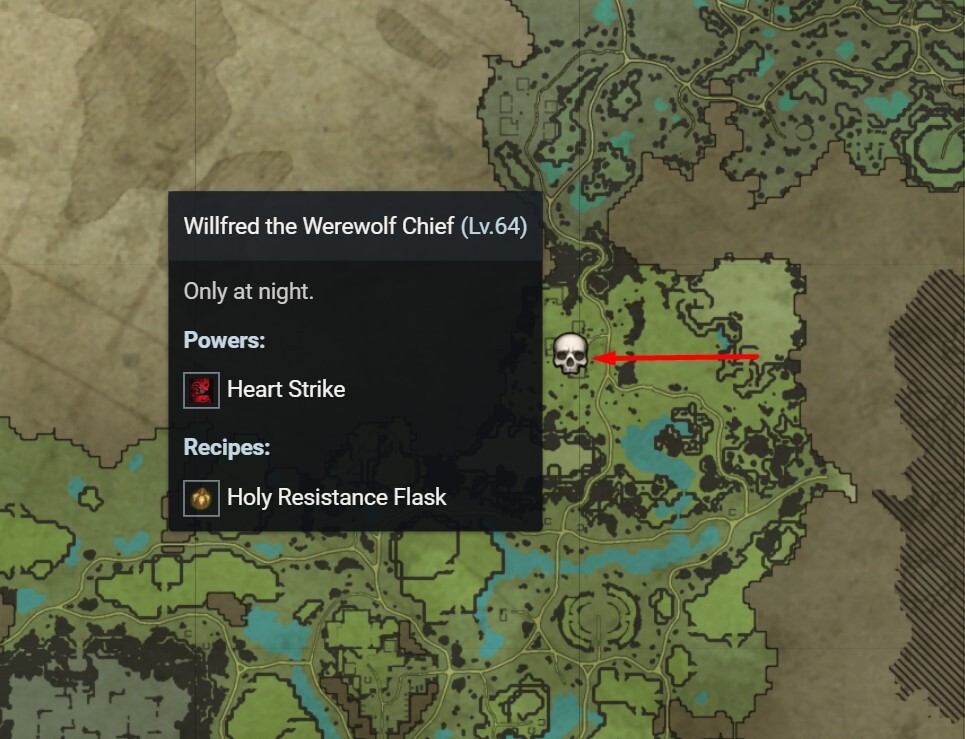 V Rising에서 Heart Strike 능력을 얻으려면 플레이어는 Dunley Farmlands의 북쪽에 위치한 Willfred Werewolf Chief 를 처치해야 합니다. 이 위치는 저주받은 숲에 들어가기 전 마지막 정거장입니다. 위치가 정확하지 않다면 브이라이징에서 더 빠르게 보스를 찾을 수 있도록 참고용 이미지 입니다.