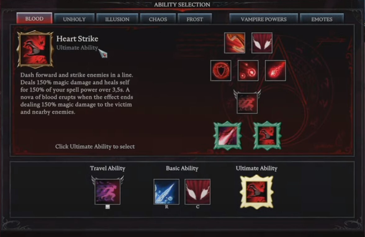 Heart Strike 궁극기 능력이 발동되면 캐릭터가 앞으로 돌진하여 한 방향으로 적을 공격합니다. 공격이 대상과 연결되면 적에게 150% 마법 피해를 입힙니다.