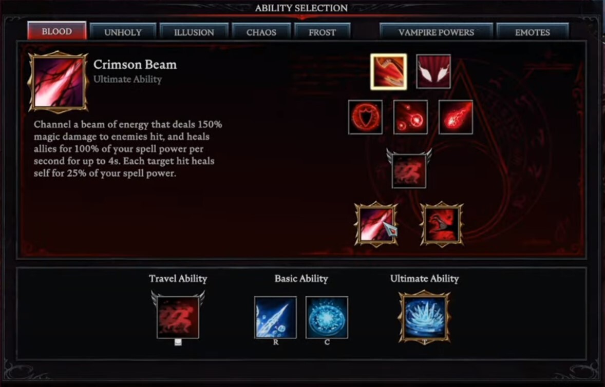 Crimson Beam은 궁극기의 경로에 있는 단일 또는 여러 대상에게 150%의 마법 피해를 줍니다. 그러나 광선이 적과 연결되면 4초 동안 주문력의 100%만큼 뱀파이어 캐릭터를 치유합니다. 그렇기 때문에 각 대상은 전체 주문력의 25%만큼 치유됩니다.