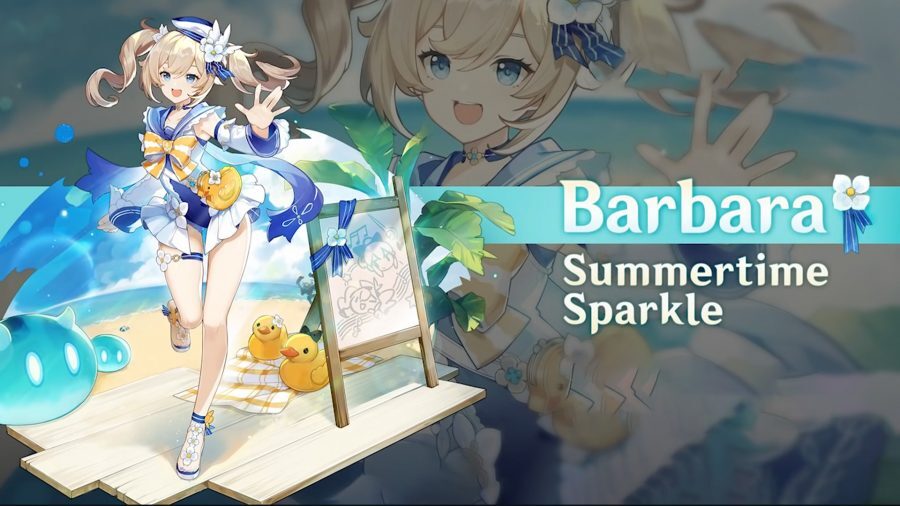 Barbara의 Summertime Sparkle 의상은 Echoing Tales 이벤트 기간 동안 일시적으로 무료였습니다 . Barbara의 대체 의상은 캐릭터 의상 상점에서 1680 Genesis Crystals로 구입할 수 있습니다.