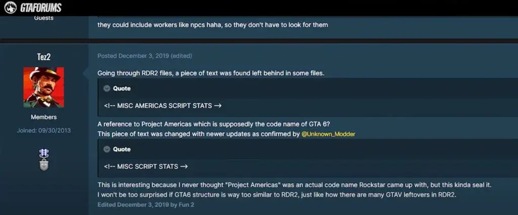 이 유출을 뒷받침하기 위해 Know의 주장과 일치하는 Reddit 게시물이 있었는데 지금은 삭제되었습니다. 유출은 GTA 6을 Project America라고 부르며 2015년부터 개발 중이라고 밝혔습니다. 그러나 Red Dead Redemption 2 출시가 가까워지면서 개발이 분명히 일시 중지/느려졌습니다.